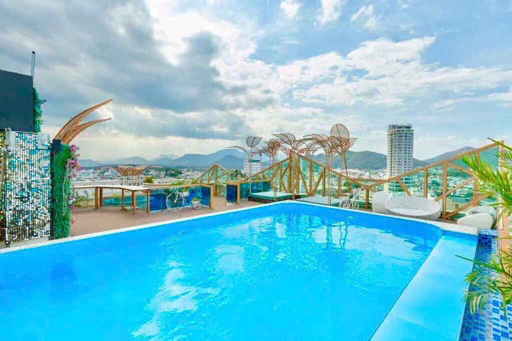 Khách sạn 4 sao. Tiêu chuẩn 2 - 3 khách/phòng. Có hồ bơi, đầy đủ tiện nghi.