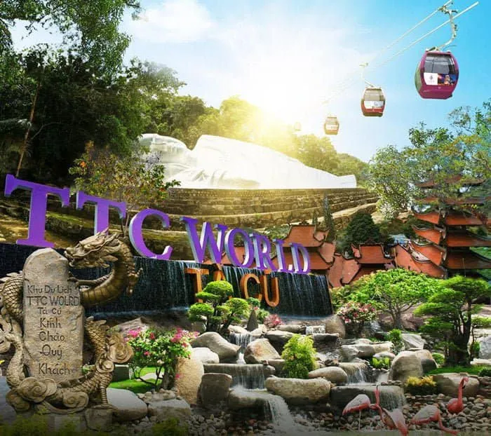 Quý khách còn có thể tự do mua vé cáp treo lên núi Tà Cú, cùng viếng chùa và tượng Phật nổi tiếng Đông Nam Á. Nếu không muốn lên núi quý khách có thể nghỉ ngơi tự do tại các quán Cà phê võng. Đoàn còn được tham quan cầu Treo, vườn hướng dương, vườn lan, cafe thủy tạ,.... hay khu vực nhà hàng có điều hòa máy lạnh. (phí cáp treo chưa bao gồm)