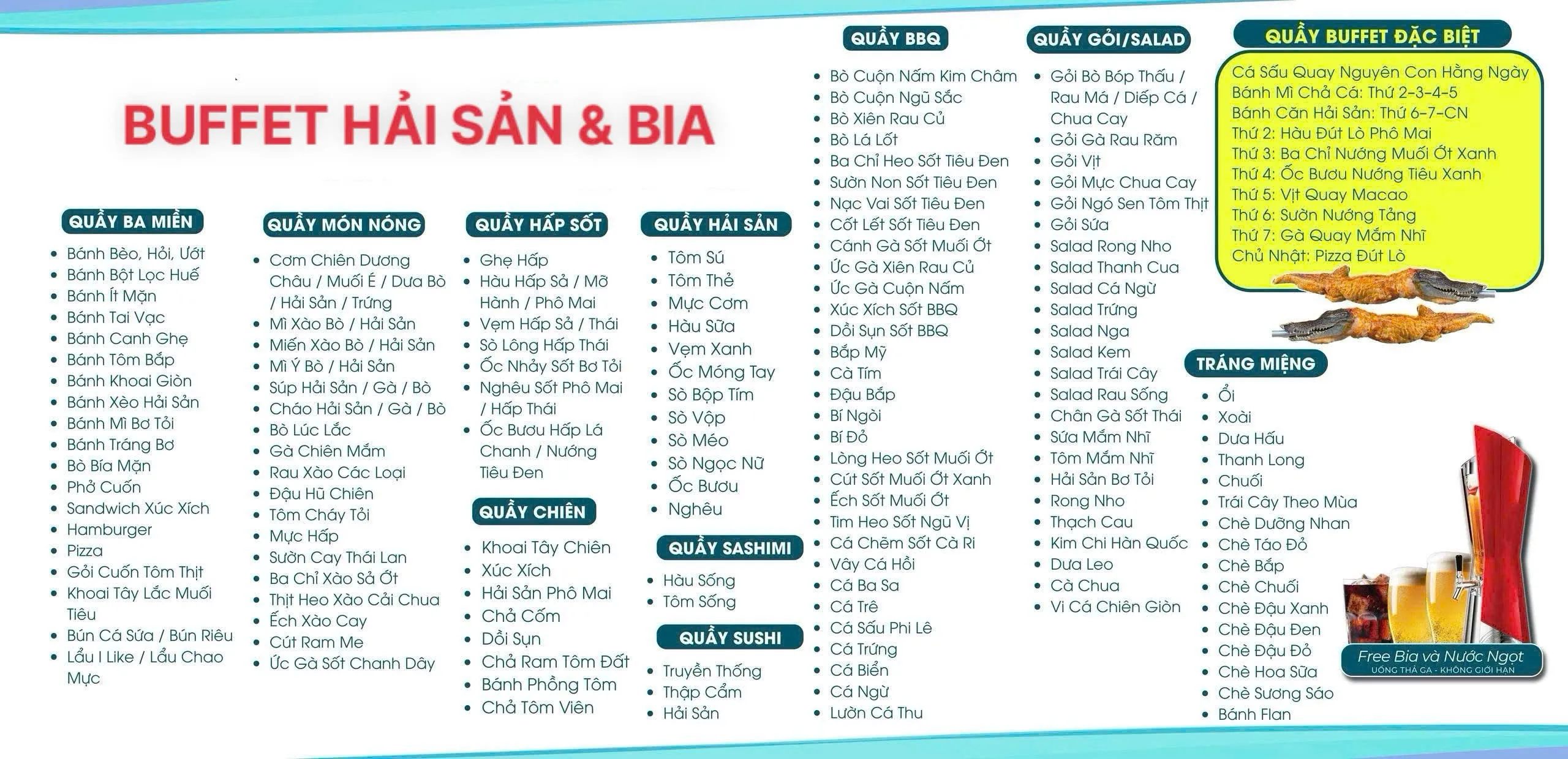 03 bữa sáng: 01 bữa tô/ly + 02 bữa buffet sáng 04 bữa ăn chính: 01 bữa buffet BBQ Hải Sản + 03 bữa set menu. |